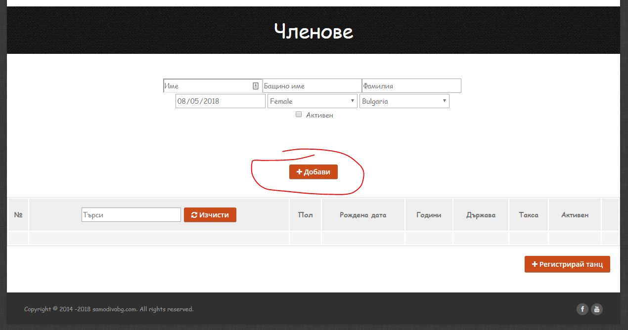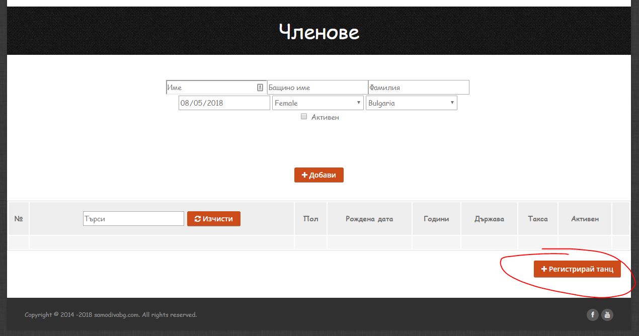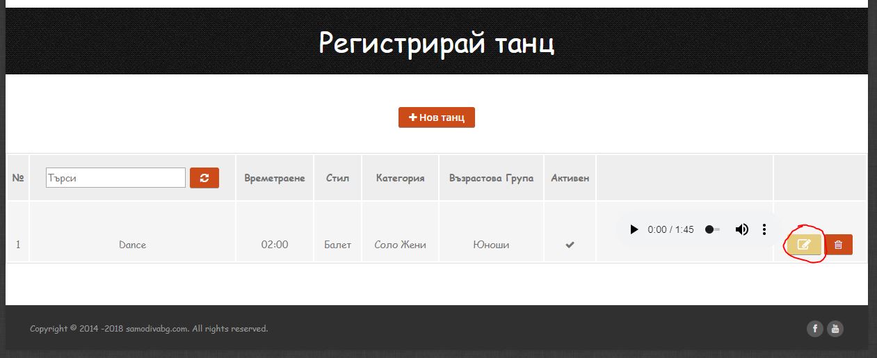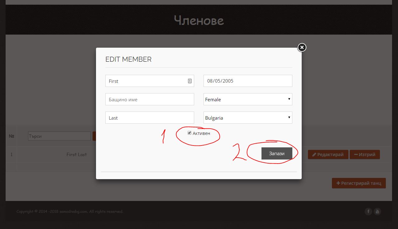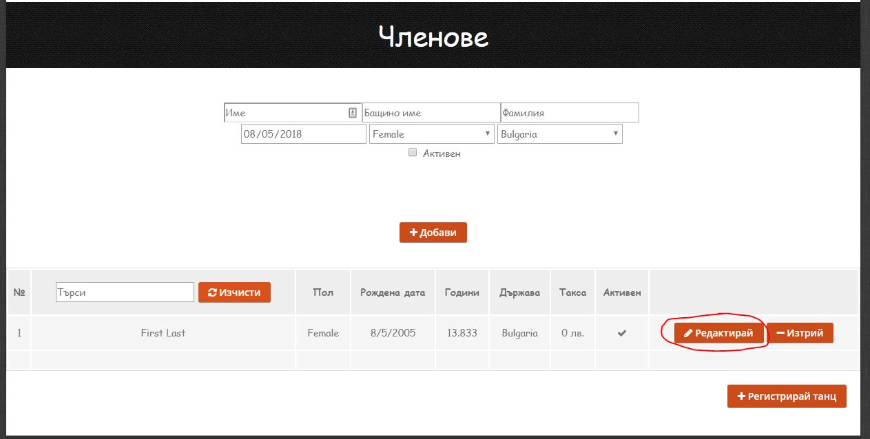 Обърнете внимание, че участник може да бъде редактиран само ако НЕ участва в Активен танц. Ако желаете да редактирате участник, който участва в активен танц отидете на бутона „ВЪВЕДИ ТАНЦ“ от навигацията.