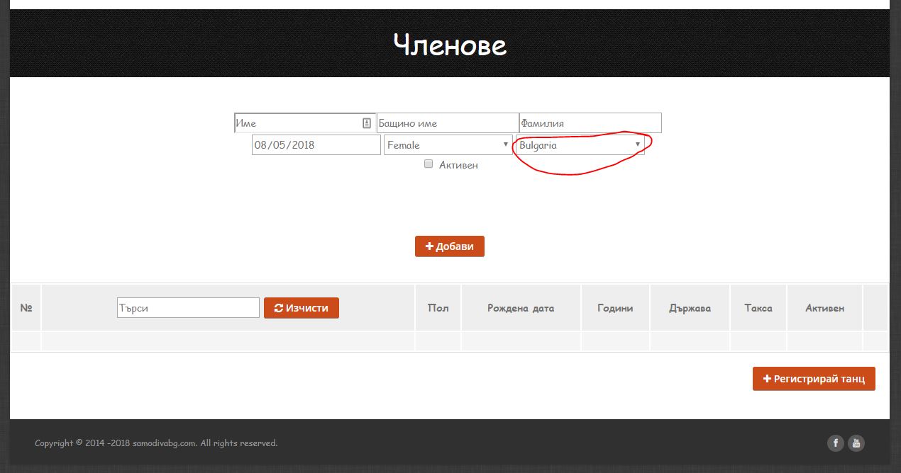 Обърнете внимание, че участник може да бъде редактиран само ако НЕ участва в Активен танц. Ако желаете да редактирате участник, който участва в активен танц отидете на бутона „ВЪВЕДИ ТАНЦ“ от навигацията.